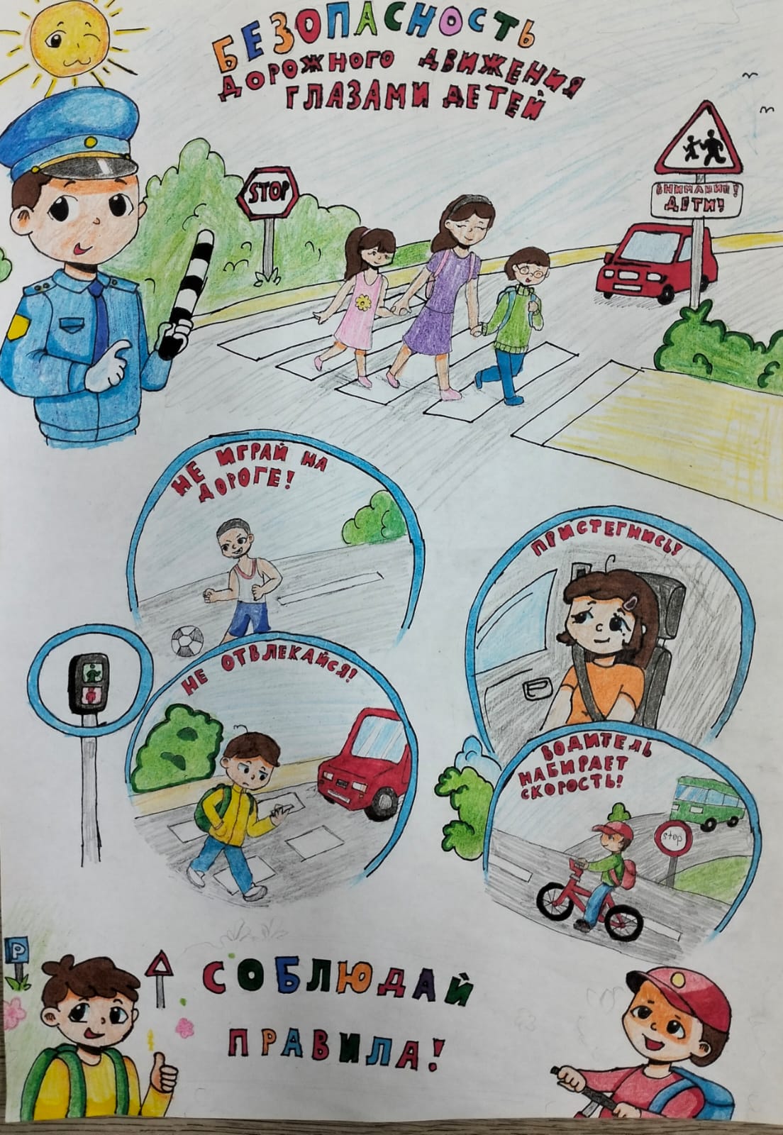 Среди 2,3,4,5,6,7 классов под руководством педагога дополнительного образования Шиллер О.Н. прошел конкурс рисунков «Безопасность дорожного движения глазами детей». В своих работах ребята продемонстрировали важность соблюдения правил дорожного движения, выразили свои представления о безопасности на дорогах и подчеркнули роль внимания и ответственности каждого участника дорожного движения -водителей, пешеходов и пассажиров.